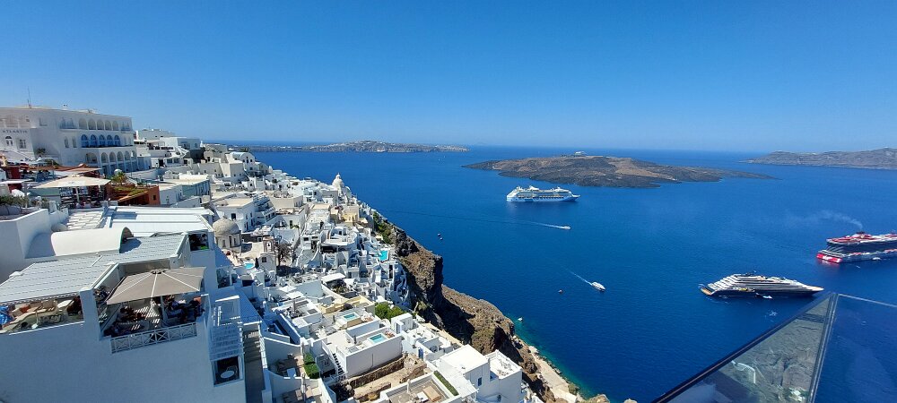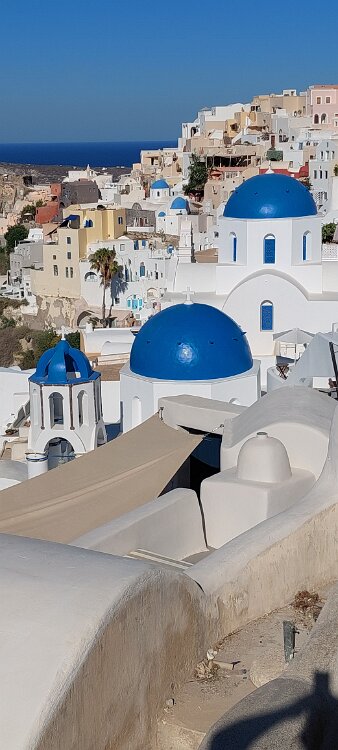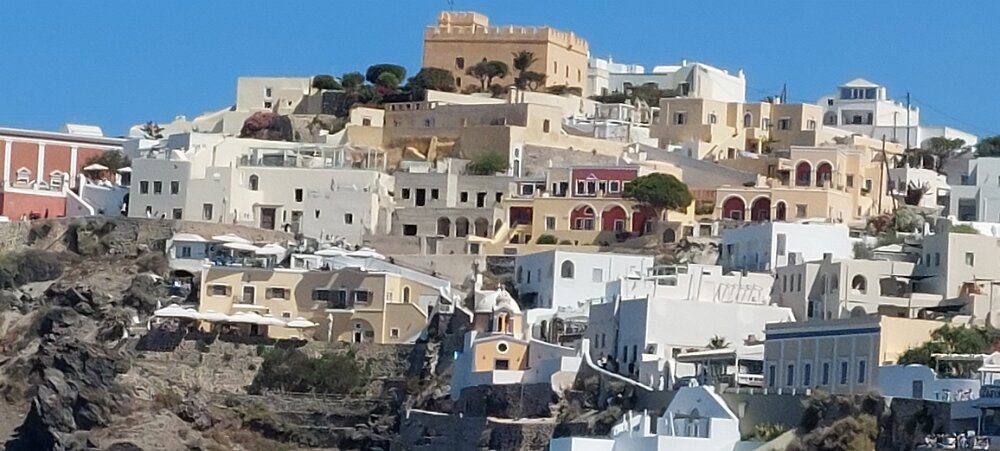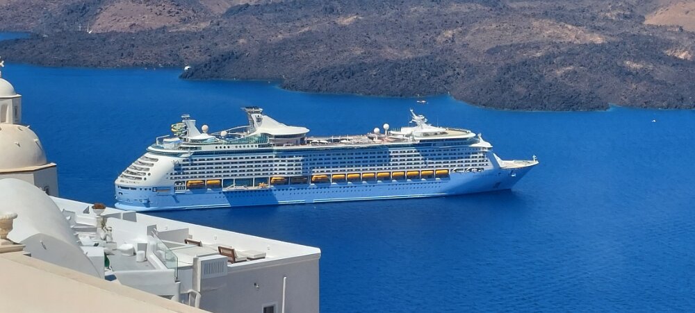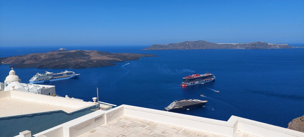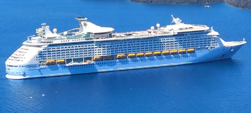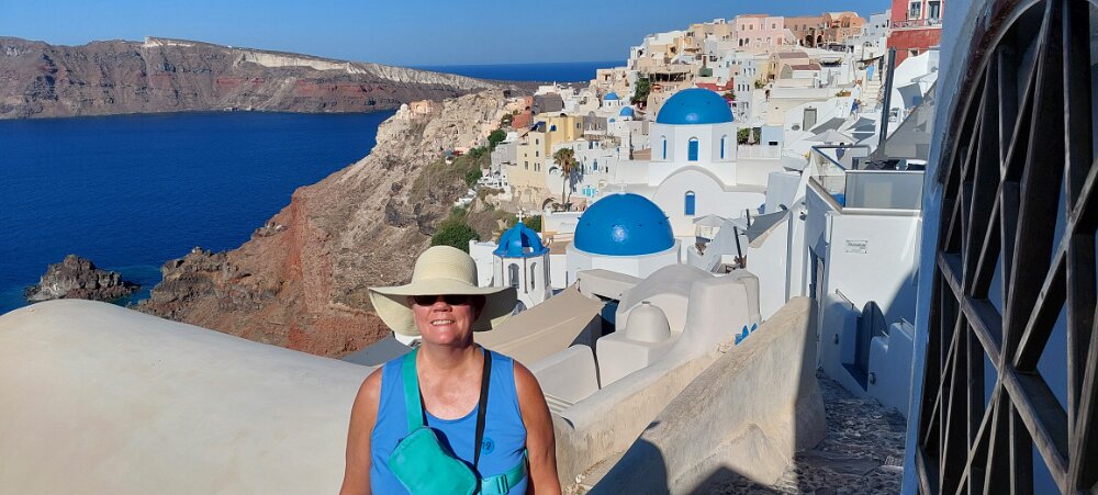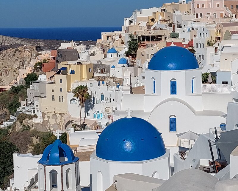 Our tender Blue domed church Blue domed church Blue domed church Blue domed church Blue domed church Town of Oia Town of Oia Town of Oia Breakfast in Oia View of blue domed churches from the patio where we had breakfast View from the patio where we had breakfast Another blue domed church Blue domed church View from the town of Fira (our ship is on the left) Our ship Our cabin is on Level 9 - one level down from the bridge where it extends out the side of the ship, and above the 4th life boat from the front. Town of Fira Town of Fira View from the town of Fira SicilyEphesus